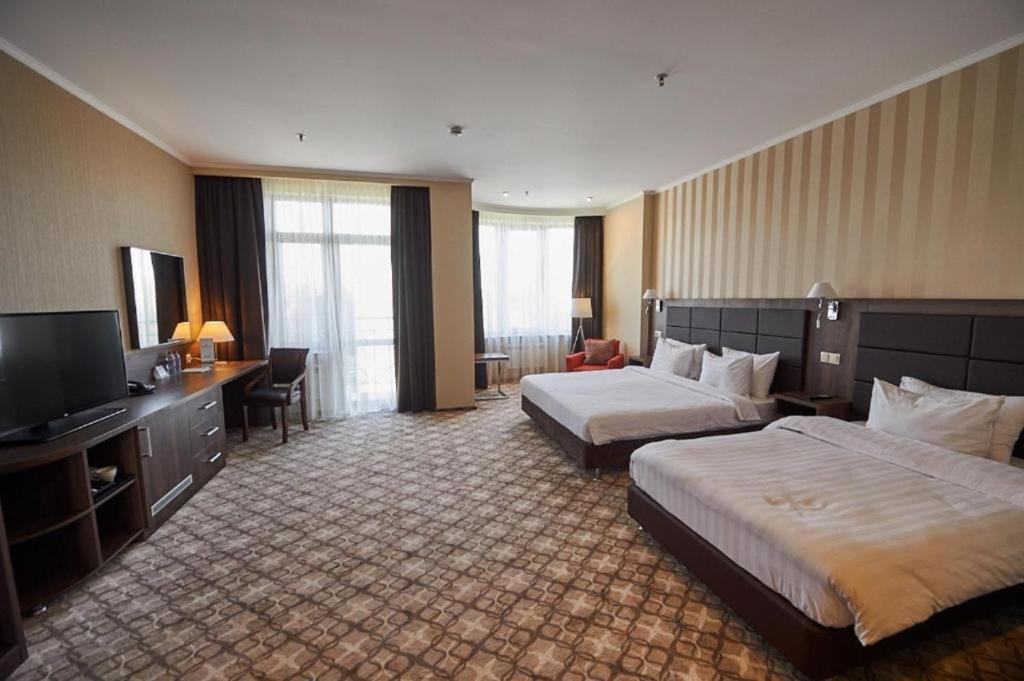 В "Семейном номер Делюкс" 40 кв.м. В номере 1 односпальная кровать и 1 большая двуспальная кровать .